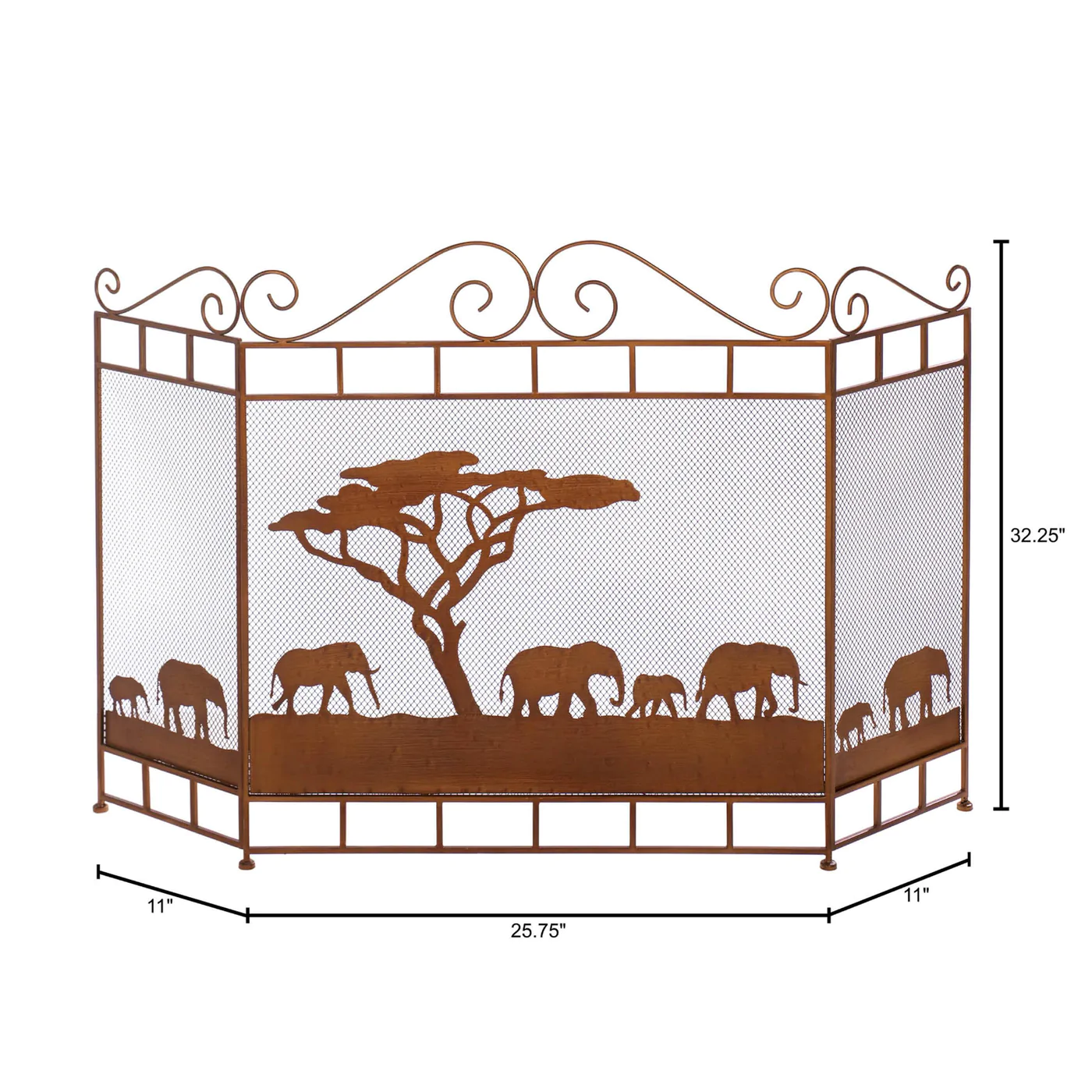 • Set the scene for style with this beautiful iron fireplace screen. The three-panel design lets you fit it to your hearth, and the artistic rendering of elephants walking across the grasslands will give your room an exotic flair.