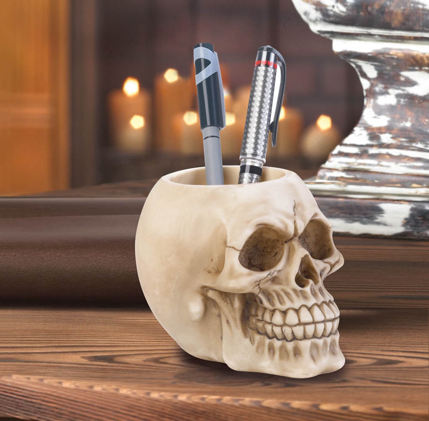 • Can be used as a helpful pen organizer, seasonal Halloween table décor, or to adorn a year-round gothic curio cabinet. This skull is a versatile ghoulish piece that is sure to be a show (or life) stopper.