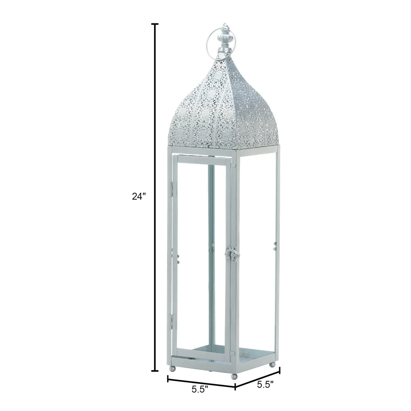 • The lantern weighs 3.8 lbs. and measures 5.5 inches by 5.5 inches by 24 inches. with loop for hanging. A spectacular silver statement piece!