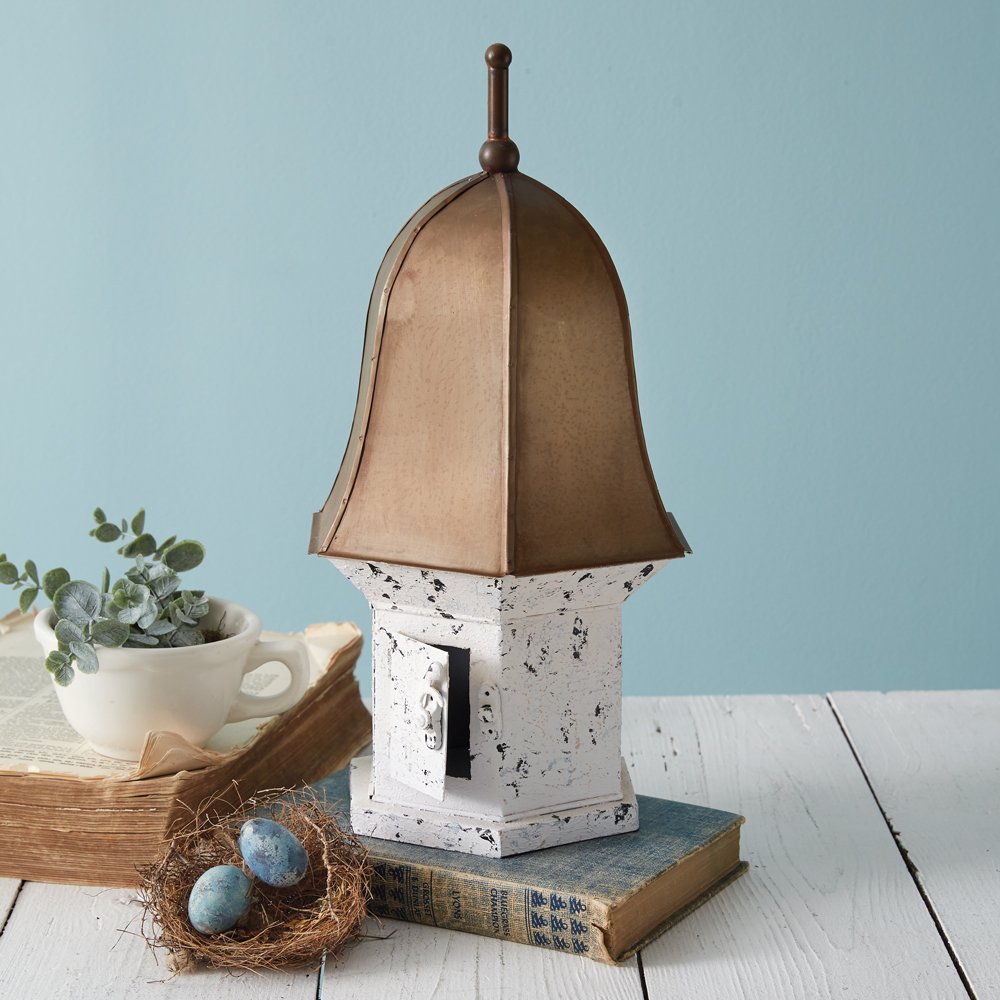 Add an elegant touch to your garden with this Queen Anne inspired birdhouse. It features chippy paint and antique bronze bell roof. Item is made of metal with a trapdoor on the back for easy cleaning. Birdhouse does not hang.